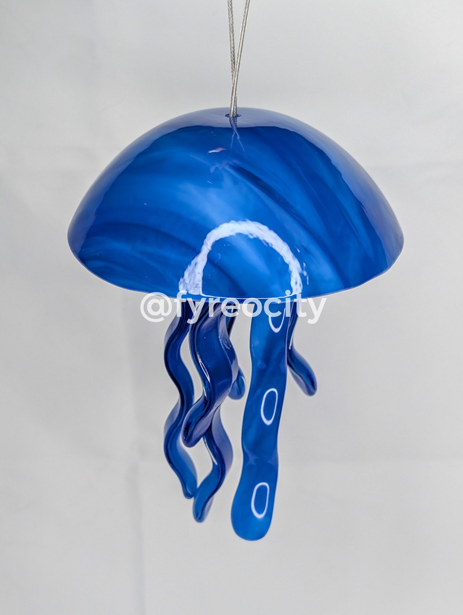 How it's Made. Jellyfish windchimes are made by cutting 3mm thick colored glass and capping it with 3mm thick clear glass for both the top and the chimes. The pieces are fused together in my glass kiln to around 1420 degrees, making the completed piece 6mm thick and very durable after fusing. The pieces are then returned to the kiln for a second firing to kiln form to shape, then are drilled and strung. Kiln firings take 12-18 hours to complete, which each jellyfish taking over 36 hours to make start to finish.
