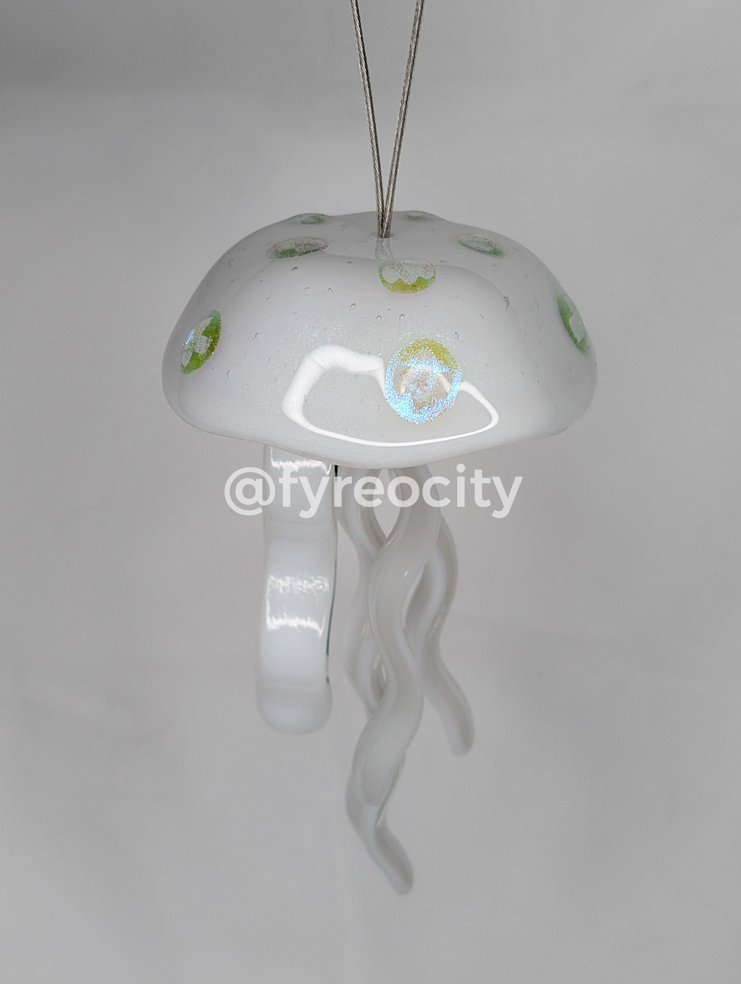 How it's Made. Jellyfish windchimes are made by cutting 3mm thick colored glass and capping it with 3mm thick clear glass for both the top and the chimes. The pieces are fused together in my glass kiln to around 1420 degrees, making the completed piece 6mm thick and very durable after fusing. The pieces are then returned to the kiln for a second firing to kiln form to shape, then are drilled and strung. Kiln firings take 12-18 hours to complete, which each jellyfish taking over 36 hours to make start to finish.