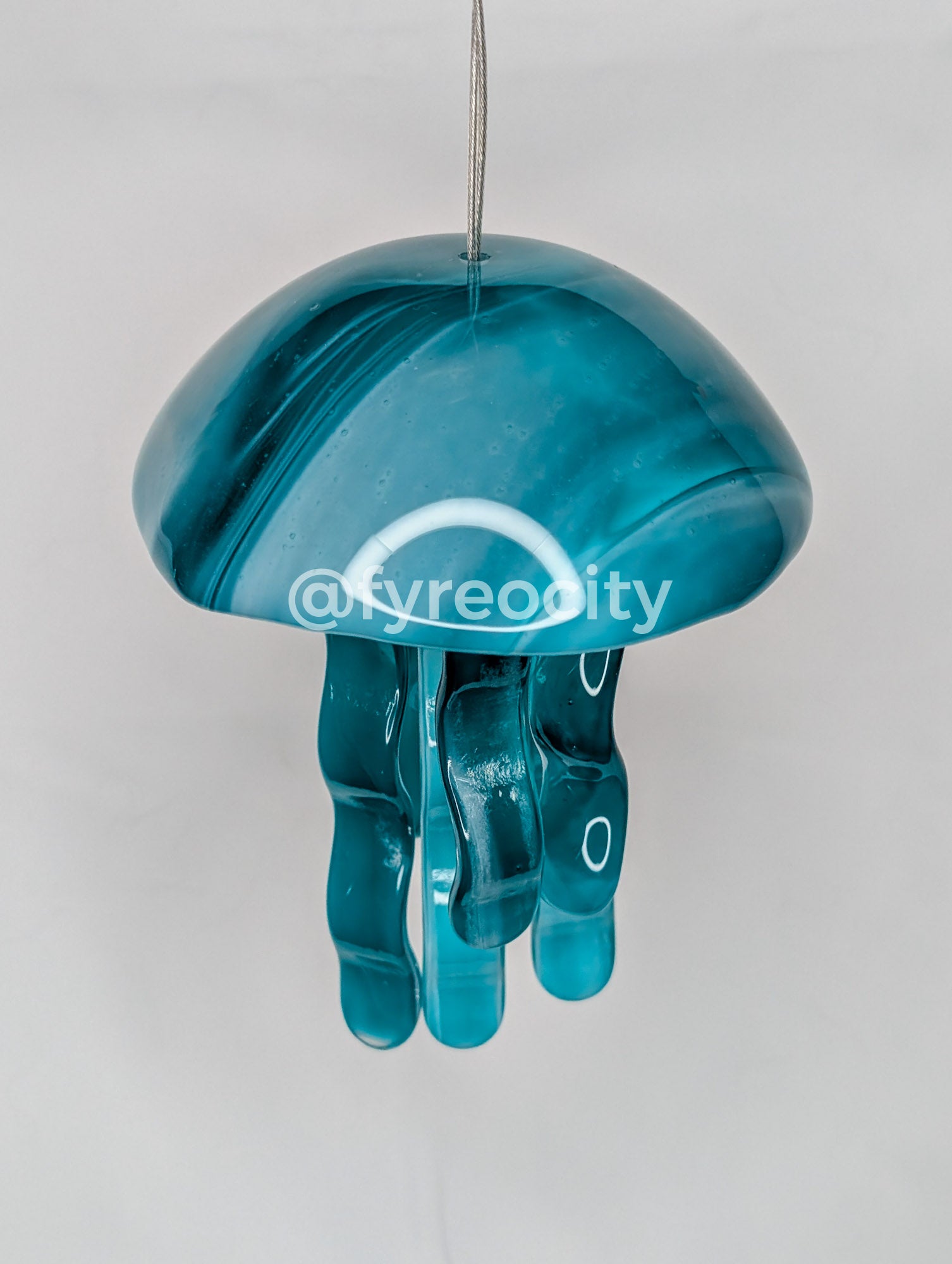 How it's Made. Jellyfish windchimes are made by cutting 3mm thick colored glass and capping it with 3mm thick clear glass for both the top and the chimes. The pieces are fused together in my glass kiln to around 1420 degrees, making the completed piece 6mm thick and very durable after fusing. The pieces are then returned to the kiln for a second firing to kiln form to shape, then are drilled and strung. Kiln firings take 12-18 hours to complete, which each jellyfish taking over 36 hours to make start to finish.