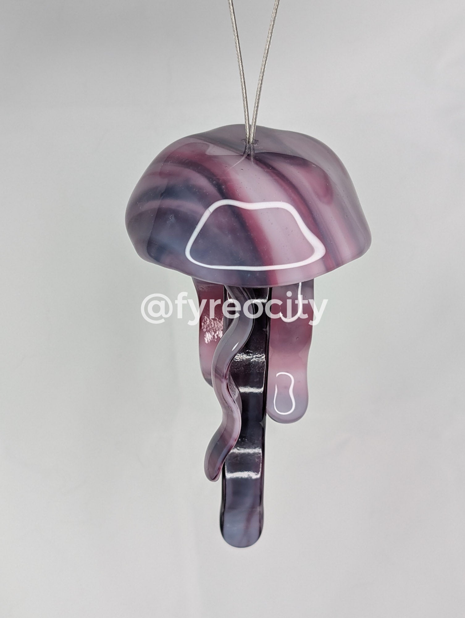 How it's Made. Jellyfish windchimes are made by cutting 3mm thick colored glass and capping it with 3mm thick clear glass for both the top and the chimes. The pieces are fused together in my glass kiln to around 1420 degrees, making the completed piece 6mm thick and very durable after fusing. The pieces are then returned to the kiln for a second firing to kiln form to shape, then are drilled and strung. Kiln firings take 12-18 hours to complete, which each jellyfish taking over 36 hours to make start to finish.