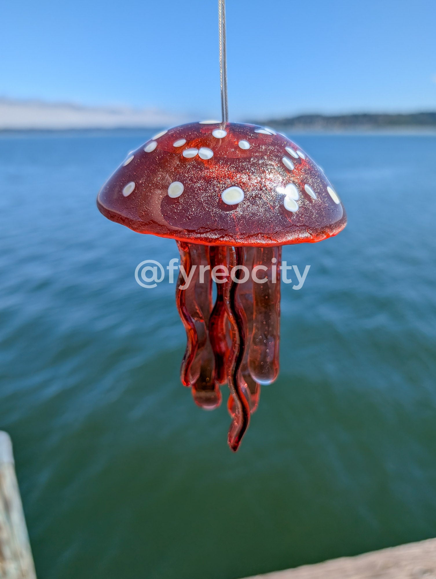 How it's Made. Jellyfish windchimes are made by cutting 3mm thick colored glass and capping it with 3mm thick clear glass for both the top and the chimes. The pieces are fused together in my glass kiln to around 1420 degrees, making the completed piece 6mm thick and very durable after fusing. The pieces are then returned to the kiln for a second firing to kiln form to shape, then are drilled and strung. Kiln firings take 12-18 hours to complete, which each jellyfish taking over 36 hours to make start to finish.